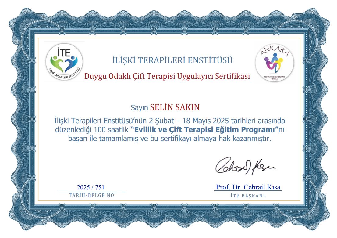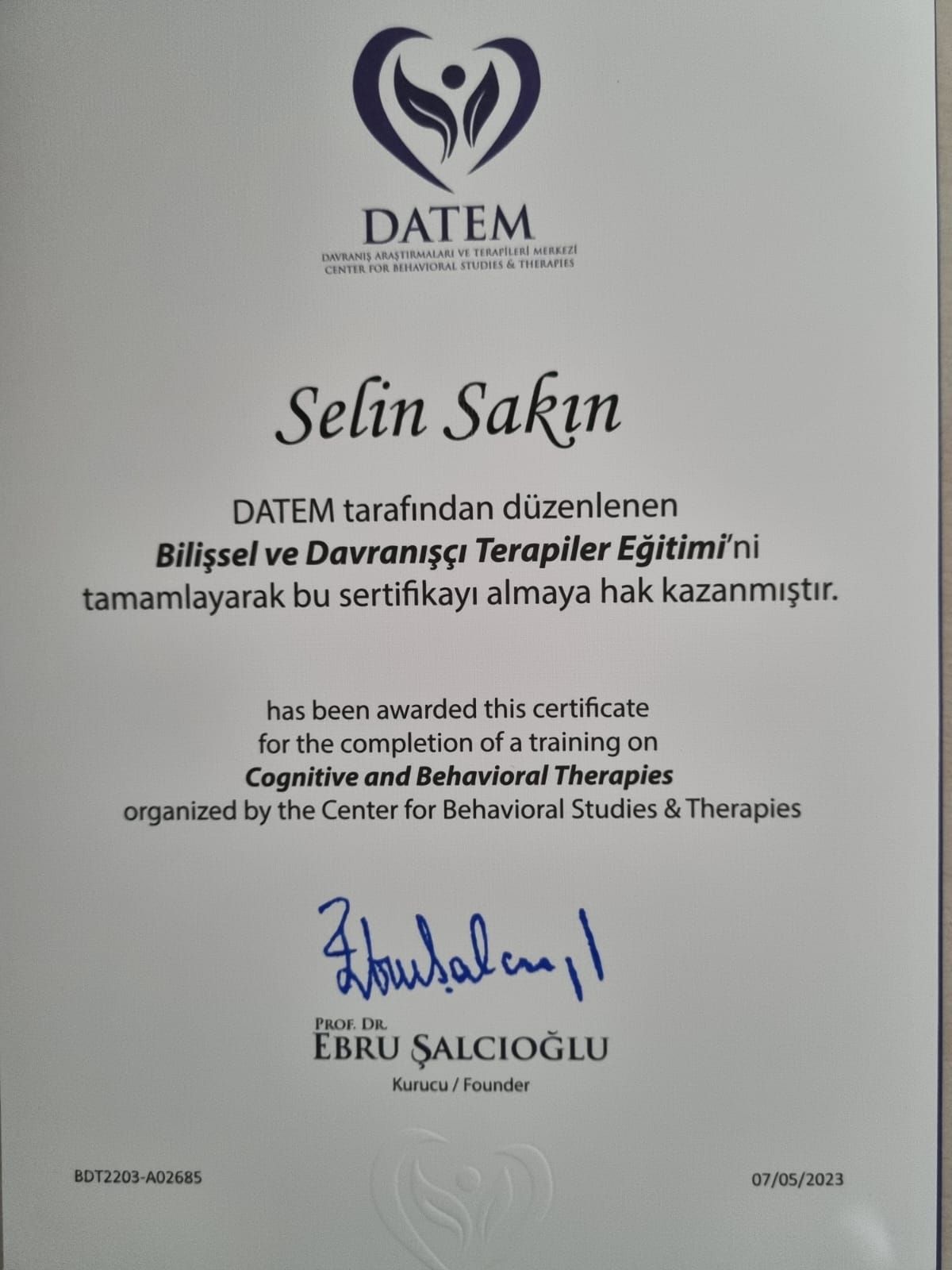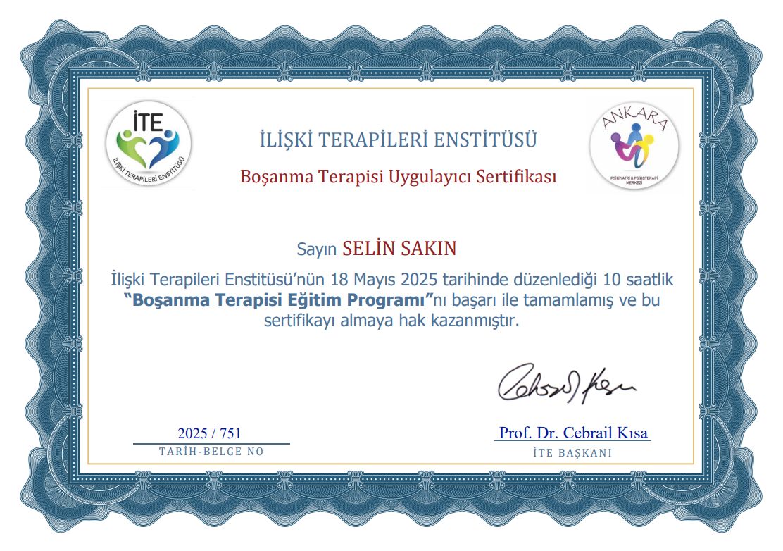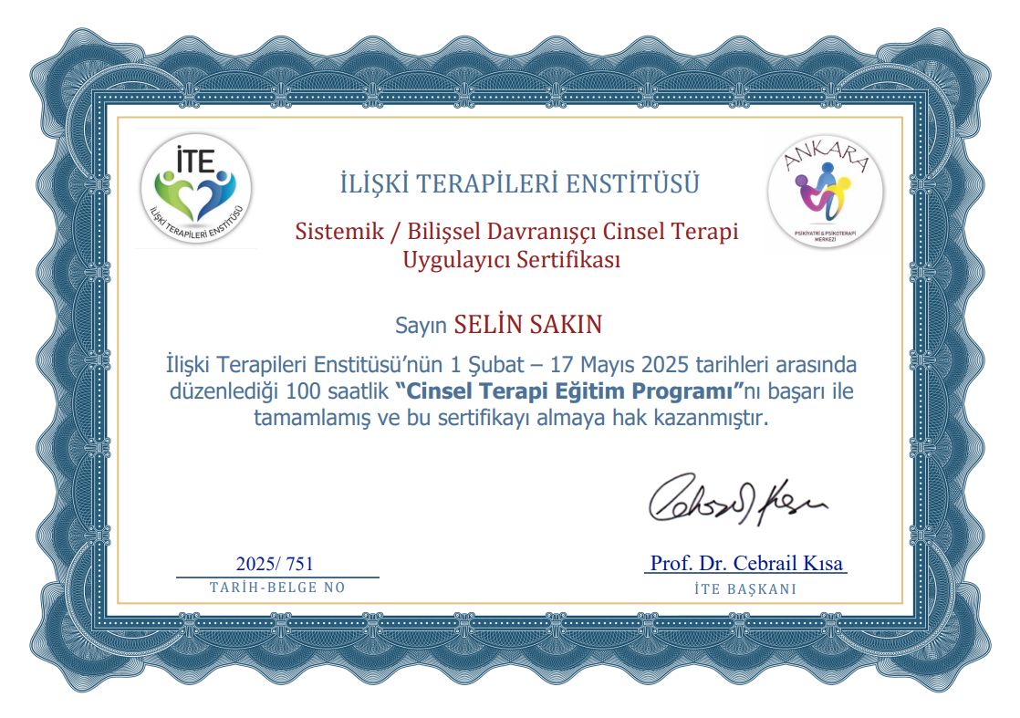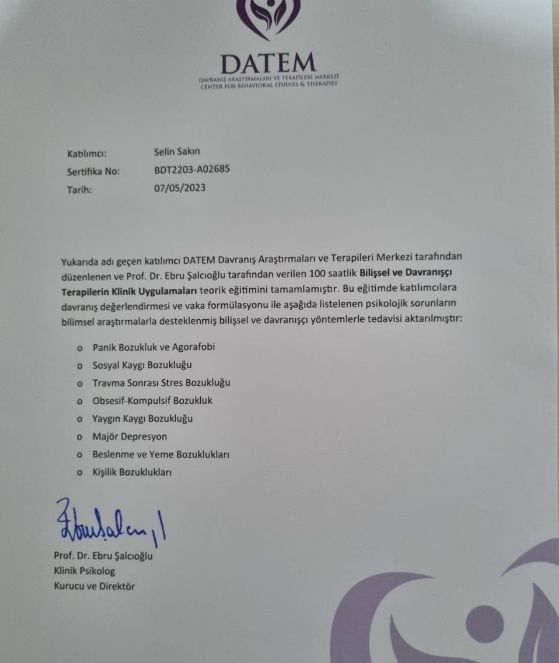 Klinik Psikolog Selin Sakın, Marmara Üniversitesi'nden mezun olduktan sonra, Okan Üniversitesi'nde Yüksek Lisans eğitimini Klinik Psikoloji alanında tamamlamıştır. Klinik Psikoloji alanında deneyimle olan Klinik Psikolog Selin Sakın, özellikle, anksiyete, okb, ilişki problemleri, borderline, panik atak konusunda çalışmalar yapmaktadır.